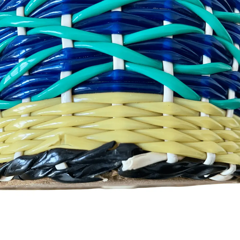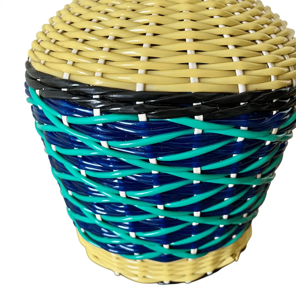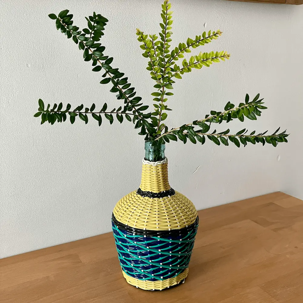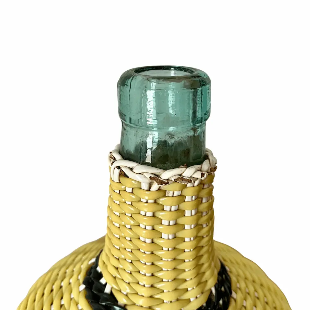 Bouteille en verre vert recouverte de scoubidous tressés, très décorative.