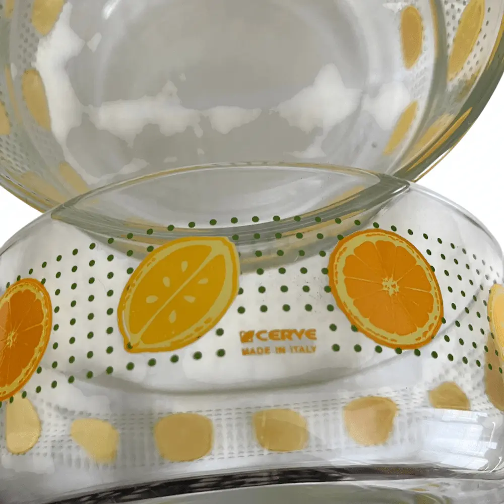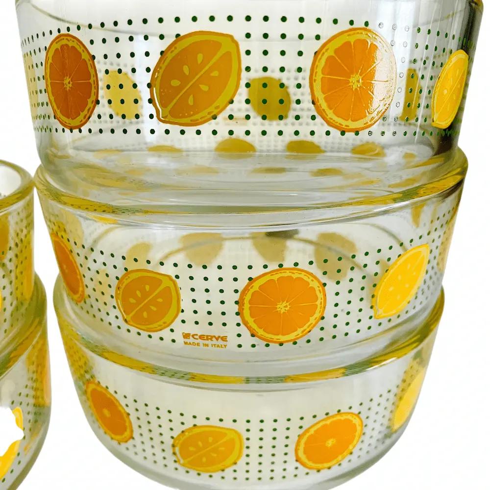 Coupelles en verre sérigraphié, motif orange et citron de la marque CERVE made in Italy datant des années 70.