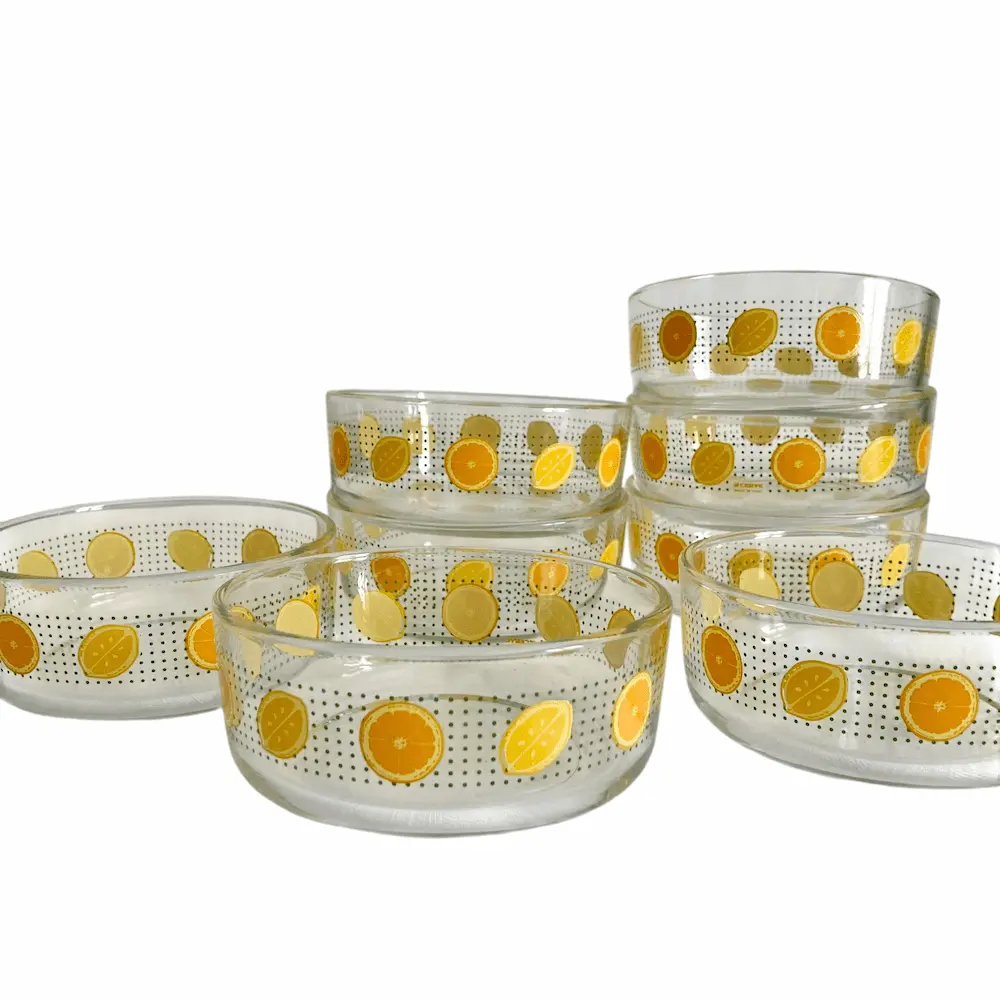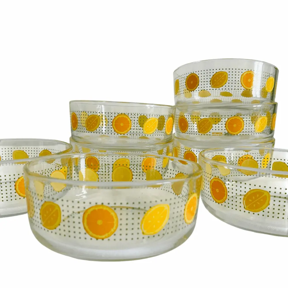Lot de 8 coupelles en verre sérigraphié, motif orange et citron de la marque CERVE made in Italy datant des années 70. Elles sont en parfait état.