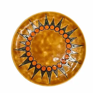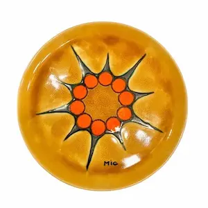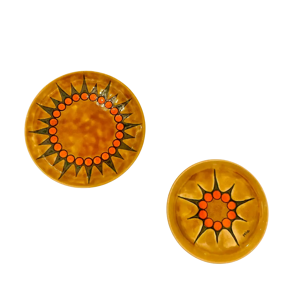 Lot de 2 assiettes murales vintage signées MIC, aux couleurs très années 70, caramel-orange et noir.