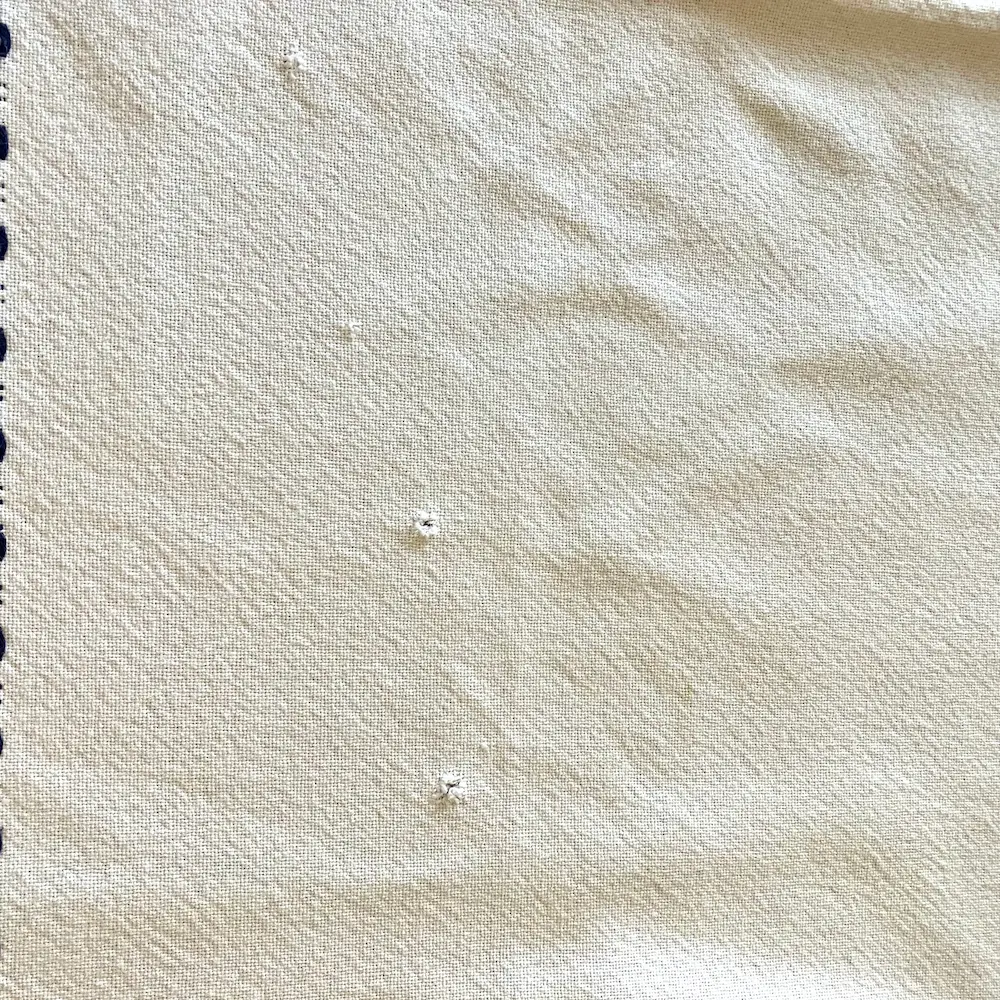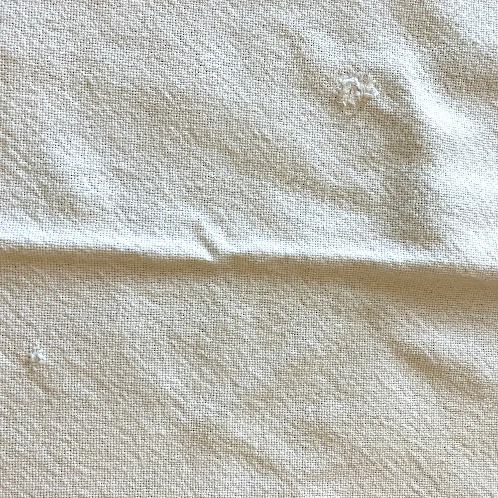 Tissu épais, à noter 4 petits trous (voir photos), une reprise (voir photo), elles sont sur le coté et non sur la partie qui est sur le plateau de la table et possibilité de quelques traces jaunies dû au temps mais à peine visible.