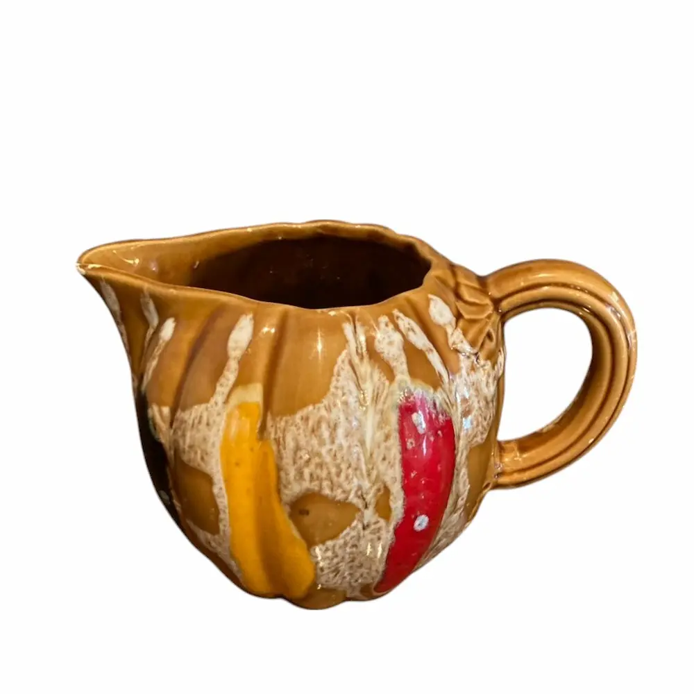 Pichet en céramique veinée, dans des couleurs d’orangé, vert kaki et crème, signé.