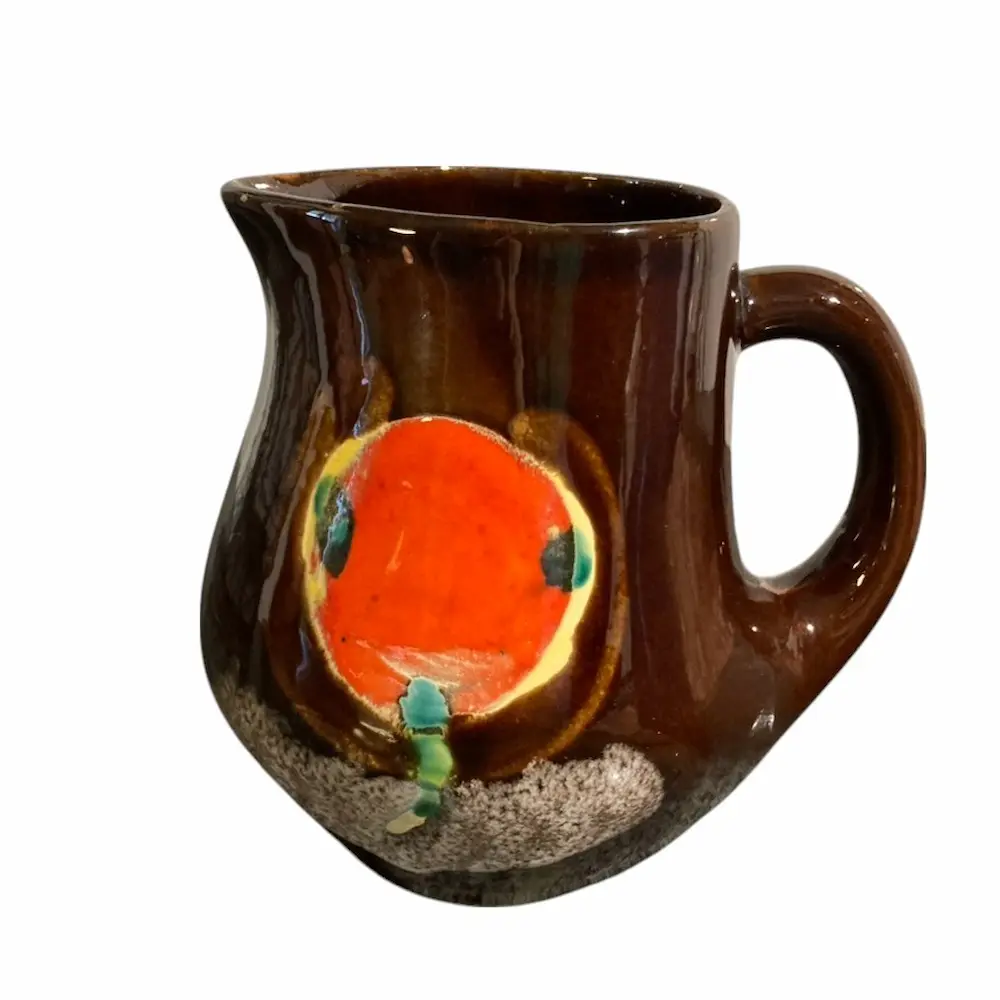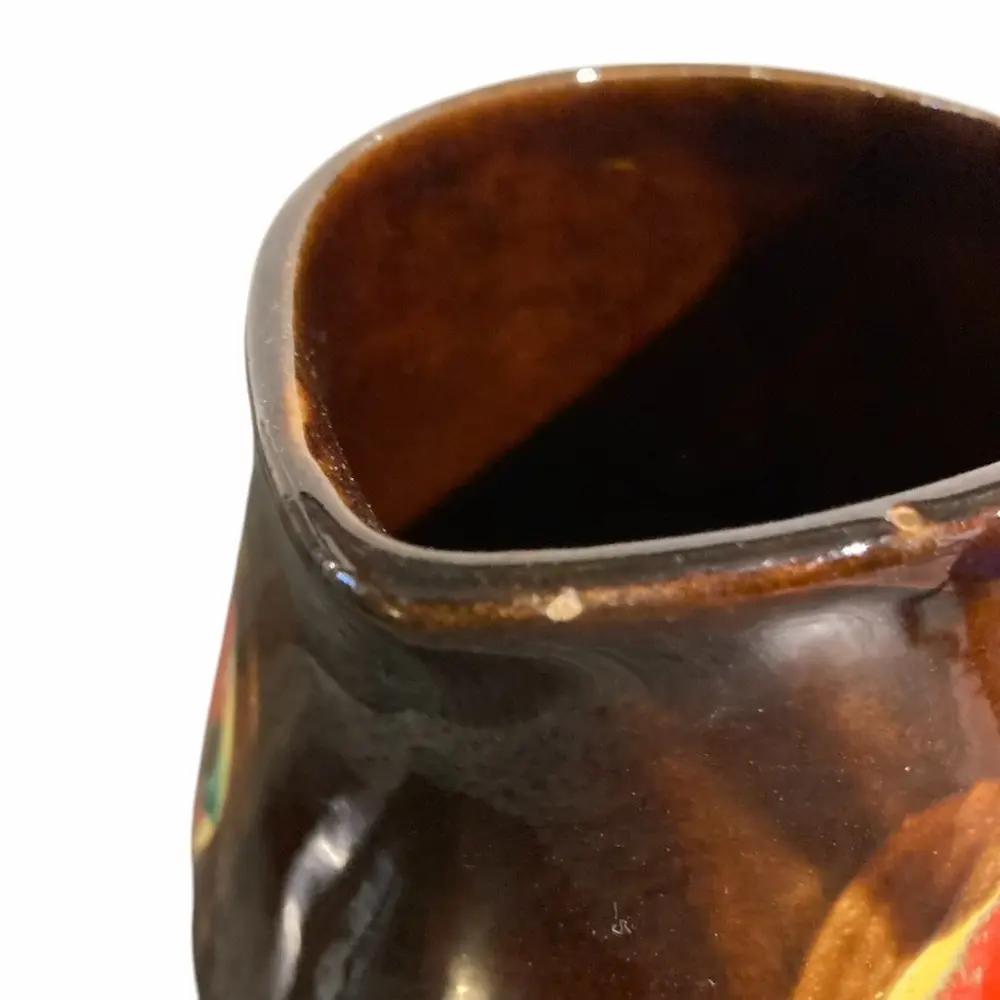 Carafe petit format en céramique brune et tâches de couleurs. Bon état général, un tous petit impact sur le rebord du bec verseur à peine visible mais qui ne gène en rien l’aspect général.