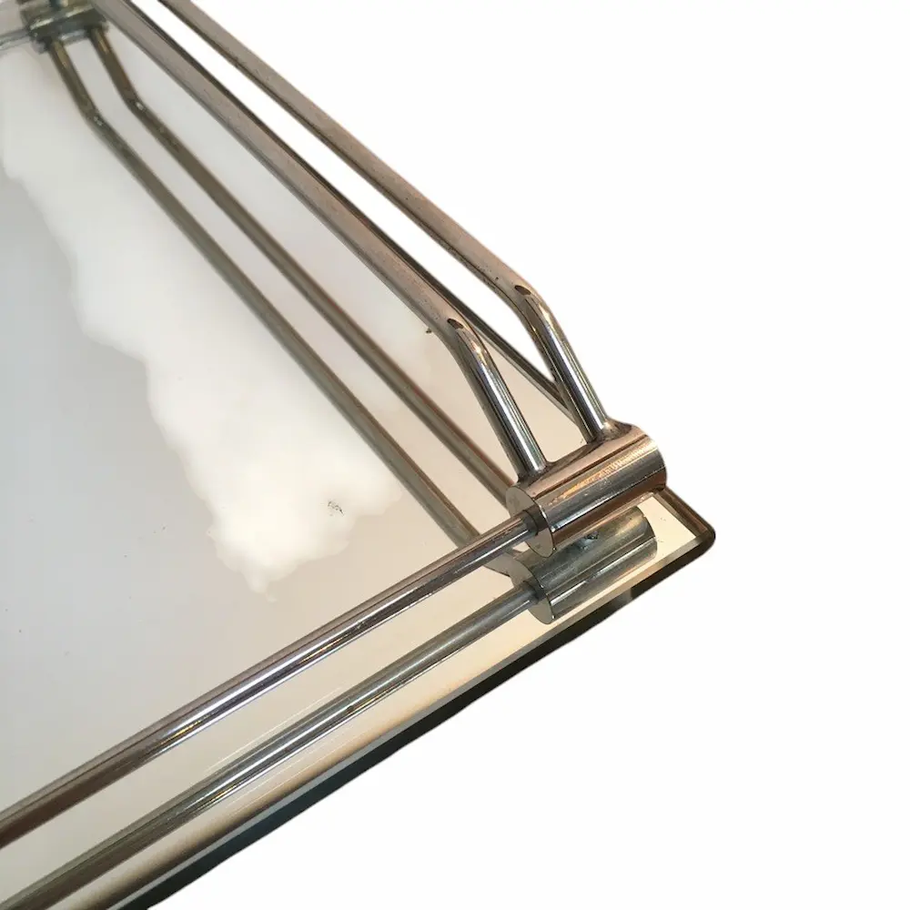 Plateau de service en miroir et poignées en métal chromé datant des années 50