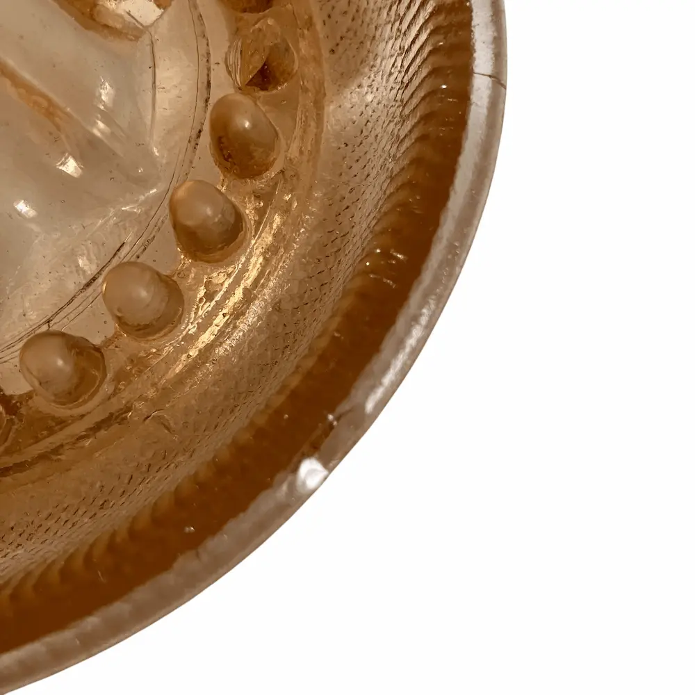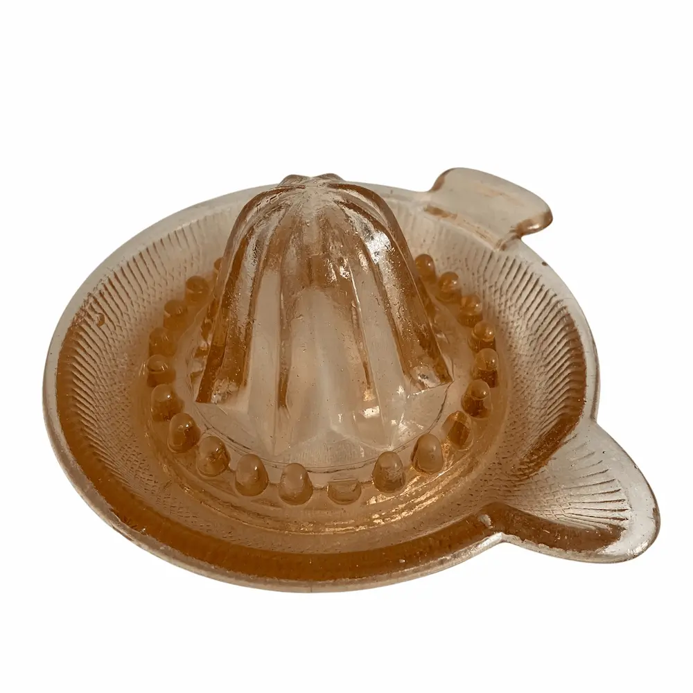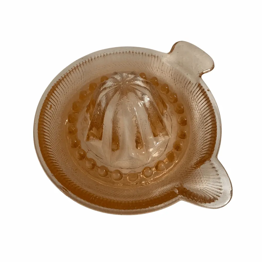 Presse-agrumes en verre transparent de couleur vieux rose avec bec verseur et anse.