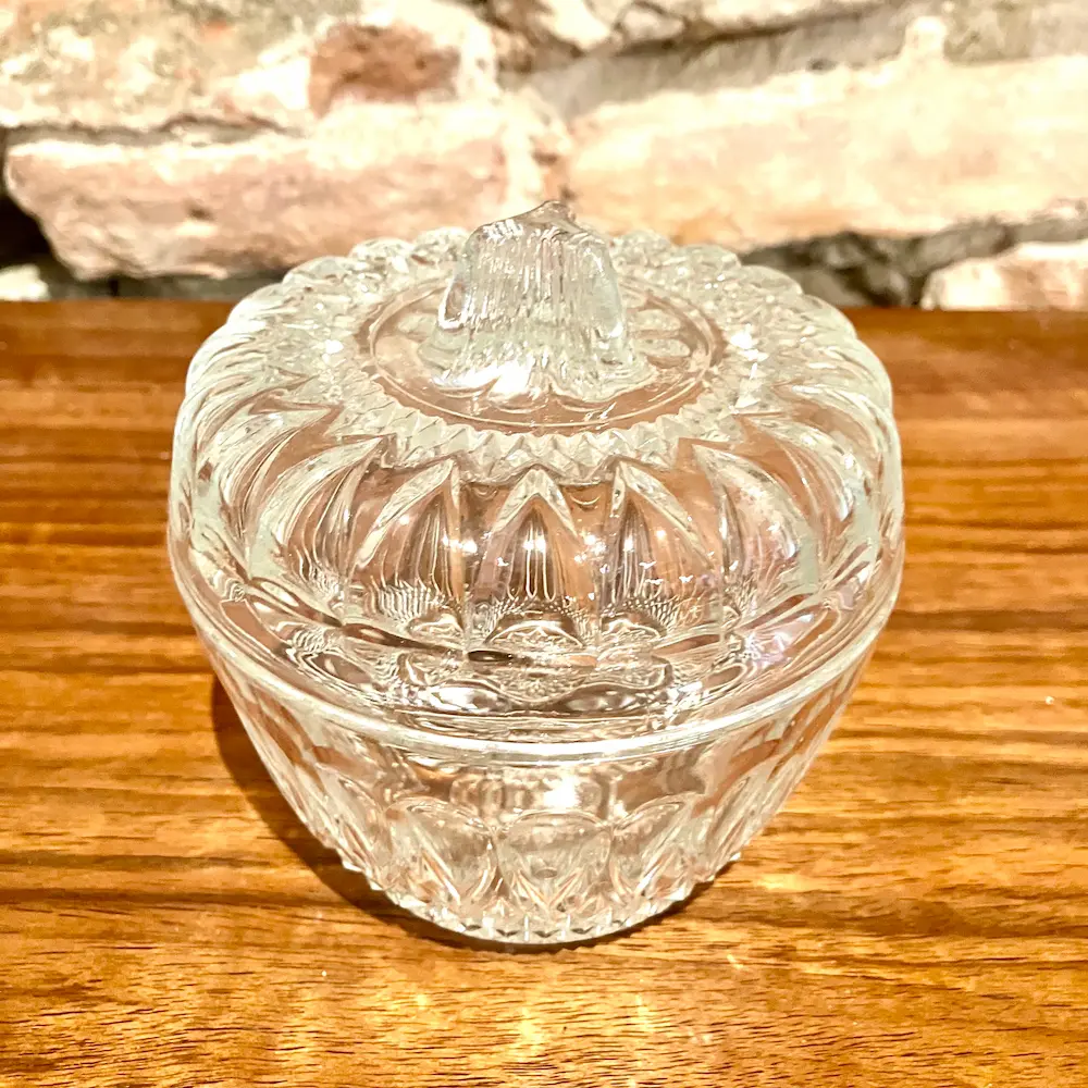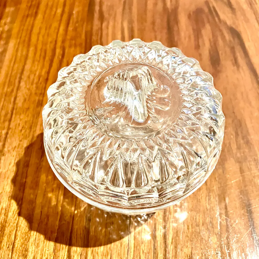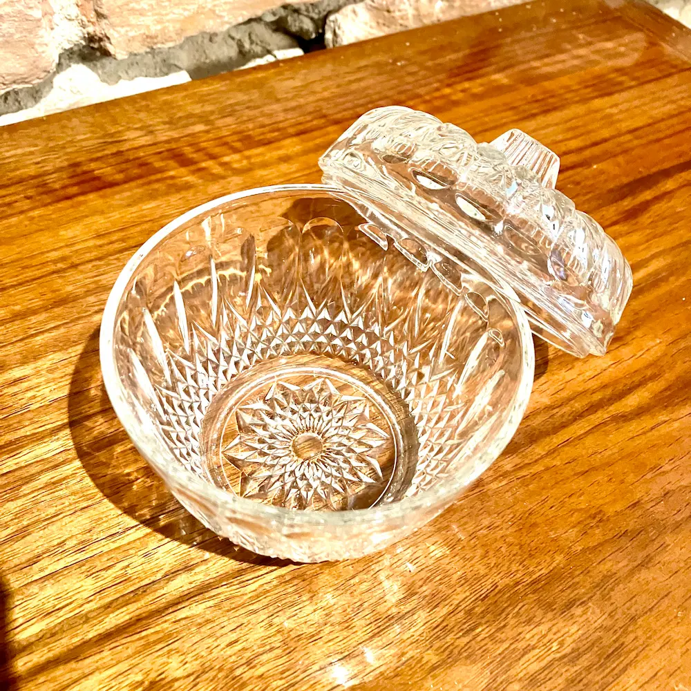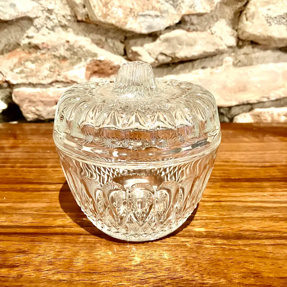 Joli sucrier ancien en verre blanc moulé. Il pourra aussi faire office de bonbonnière, boîte à bijoux, ou servir pour vos cotons démaquillant sur une jolie coiffeuse.