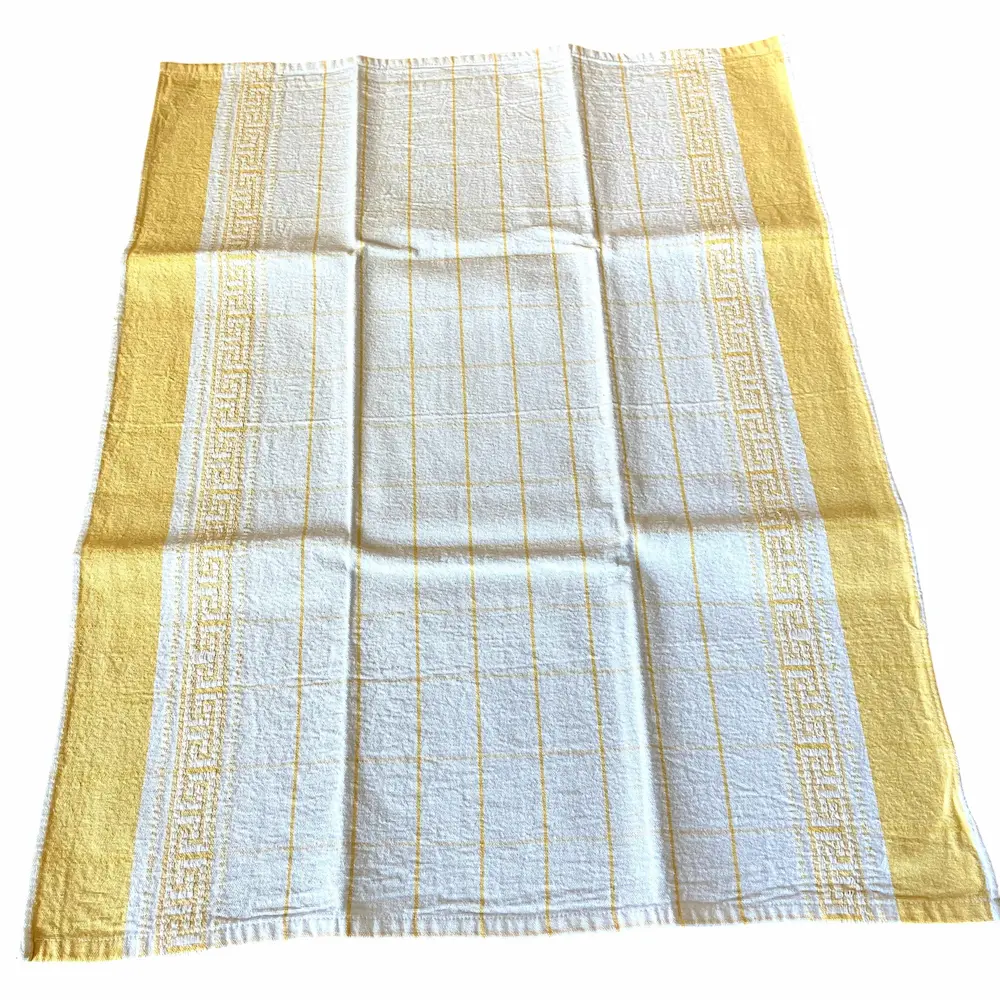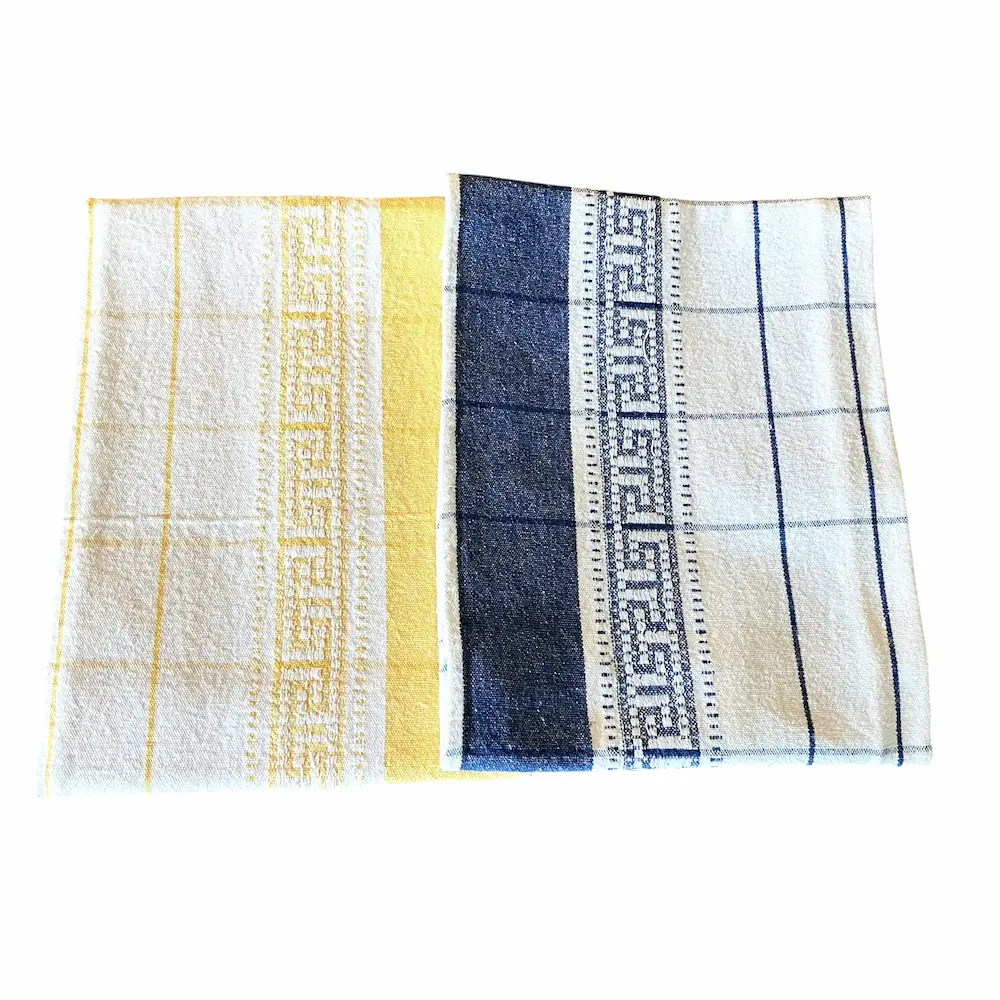 Lot de 2 torchons en coton de couleurs blanc/bleu et blanc/jaune, ornés d’une frise.