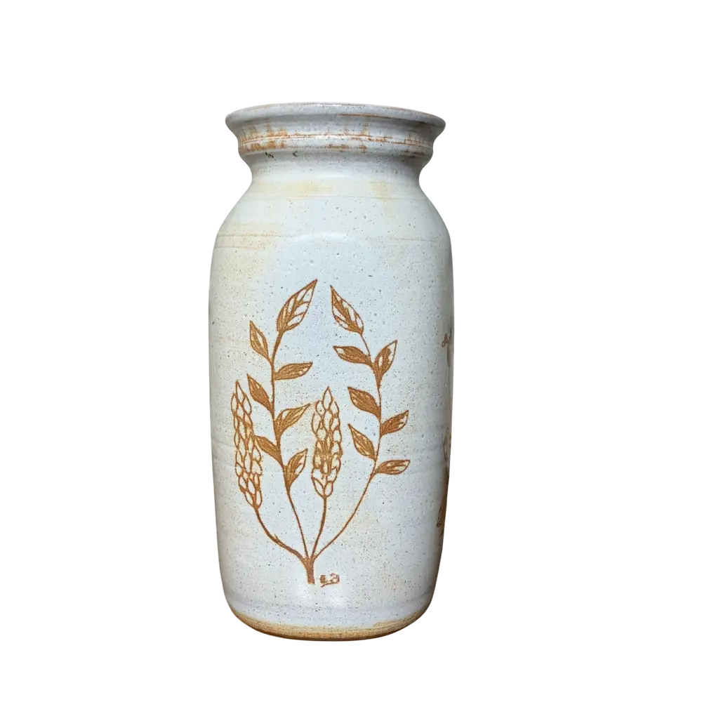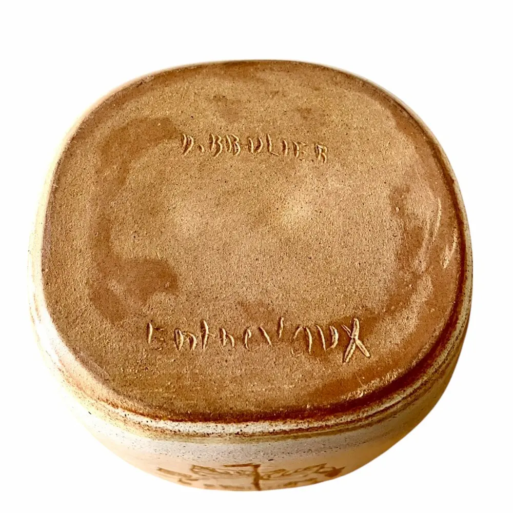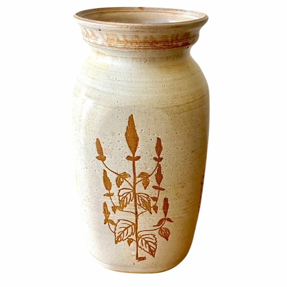 Vase en grès vintage datant des années 70, 4 faces avec chacune un décor floral dans le style herbier. Il est signé M.Brulier Entrevaux. Etat parfait.